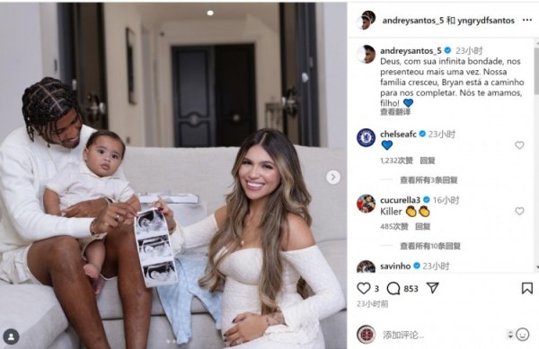 10月17日讯 切尔西中场安德烈-桑托斯更新社媒动态,晓谕老婆怀上二胎。 安德烈-桑托斯社媒晒出一家合照,晓谕老婆怀上二胎,配文:“天主以其无限的仁慈,再次赐予咱们恩典。咱们的家庭将迎来新成员,布莱恩行将到来,使咱们愈加齐全。咱们爱你,孩子!”......