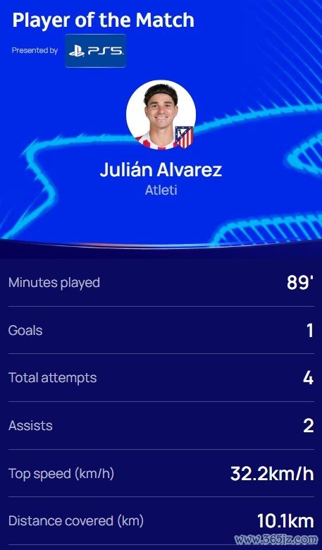 本场比赛阿尔瓦雷斯1粒进球2次助攻,赛后他也当选欧冠官方评比出的本场最好球员。