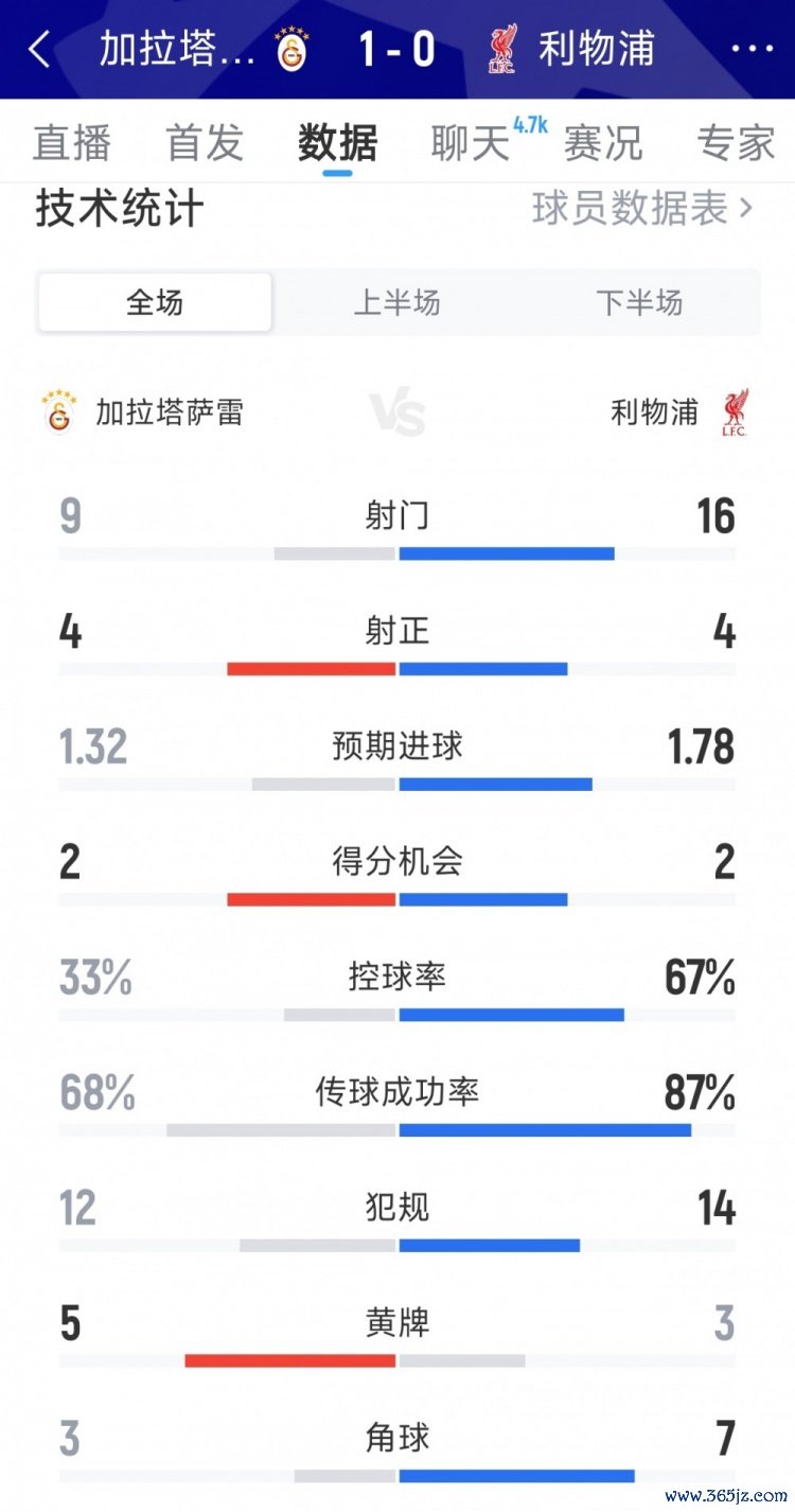 利物浦0-1加拉塔萨雷全场数据:射门16-9,射正4-4,得分契机2-2