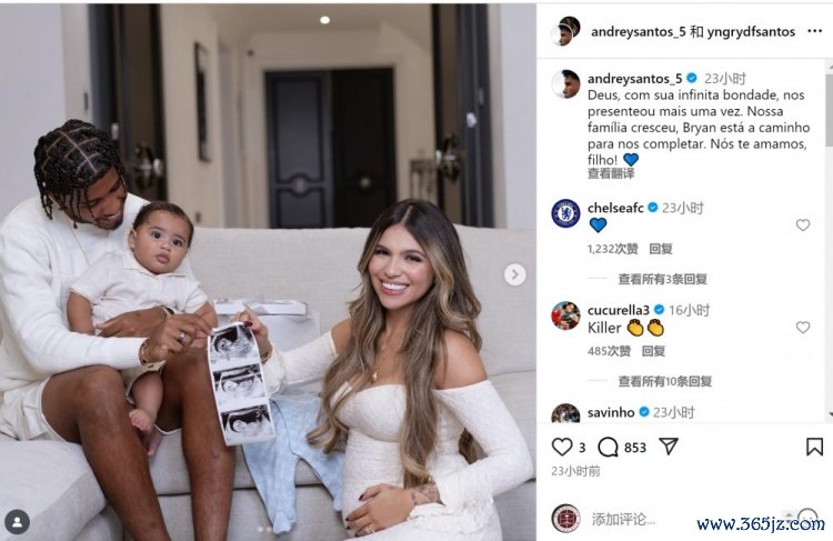 10月17日讯 切尔西中场安德烈-桑托斯更新社媒动态,晓谕老婆怀上二胎。