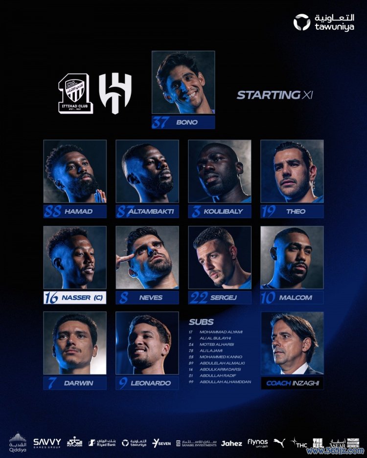 利雅得眉月首发:37-布努、19-特奥、3-库利巴利、87-坦巴蒂、88-哈马德-亚米、10-马尔科姆、22-米林科维奇、8-鲁本-内维斯、16-纳赛尔-多萨里、9-莱昂纳多、7-努涅斯