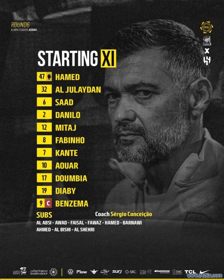 吉达皆集首发:47-哈麦德、32-朱莱丹、6-萨德-穆萨、2-达尼洛、12-米塔赫、8法比尼奥、7-坎特、10-奥亚尔、17-敦比亚、19-迪亚比、9-本泽马