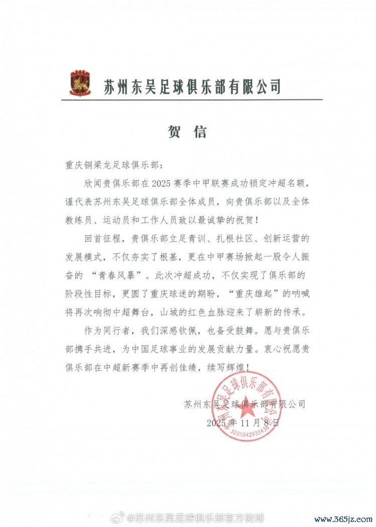 欣闻贵俱乐部在2025赛季中甲联赛收效锁定冲超限额,谨代表苏州东吴足球俱乐部整体成员,向贵俱乐部以及整体造就员、畅通员和使命主谈主员致以最诚挚的道喜!