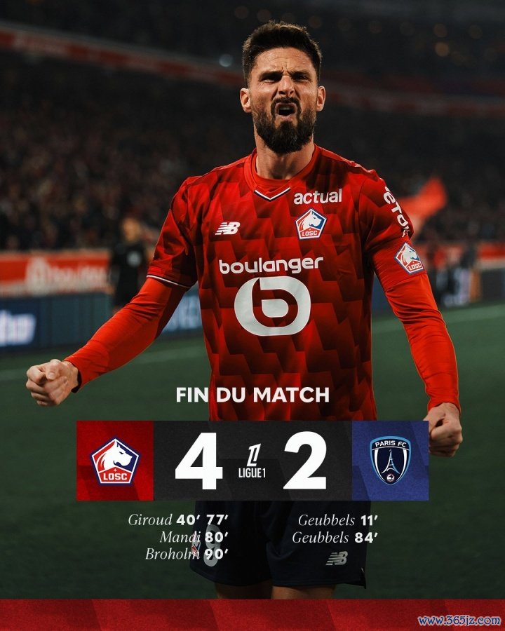 11月24日讯 法甲第13轮,里尔主场4-2逆转巴黎FC,39岁的里尔中锋吉鲁本场比赛梅开二度,驱逐各项赛事9场进球荒。据OPTA统计,吉鲁也成为1947/1948赛季以来,法甲梅开二度年岁最大的球员。