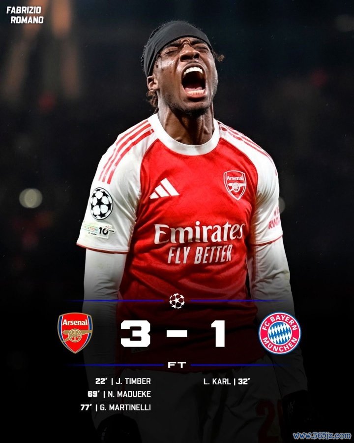 11月27日讯 本轮欧冠焦点战,阿森纳3-1打败拜仁,阿森纳本赛季在欧冠的战绩来到5场全胜!