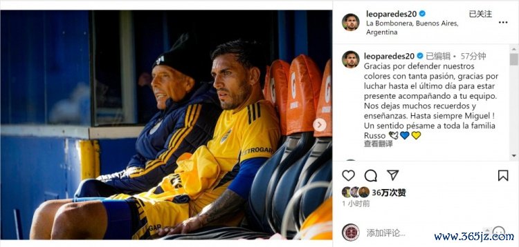 10月9日讯 博卡后生主帅鲁索死亡,帕雷德斯社媒发文吊祭。