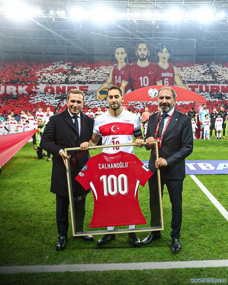 恰尔汗奥卢在对阵保加利亚的比赛中实现国度队出战100场里程碑,此役赛前土耳其队向他颁发了挂牵球衣。