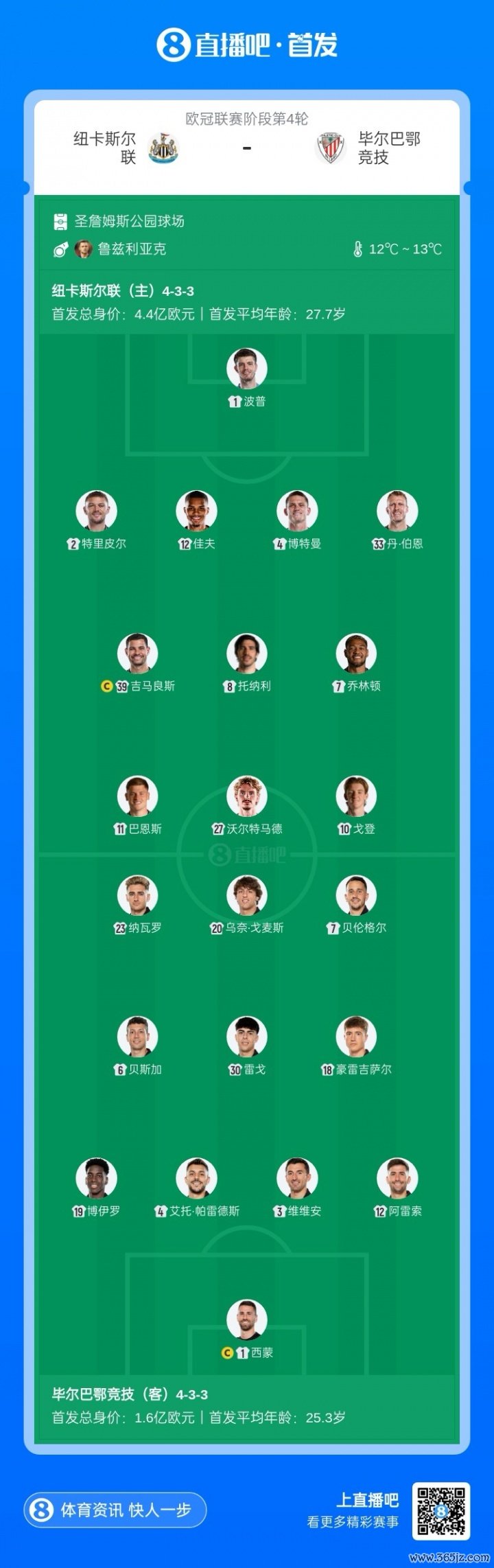 11月06日讯 欧冠联赛阶段第4轮 纽卡斯尔联主场迎战毕尔巴鄂竞技,赛前首发名单公布。