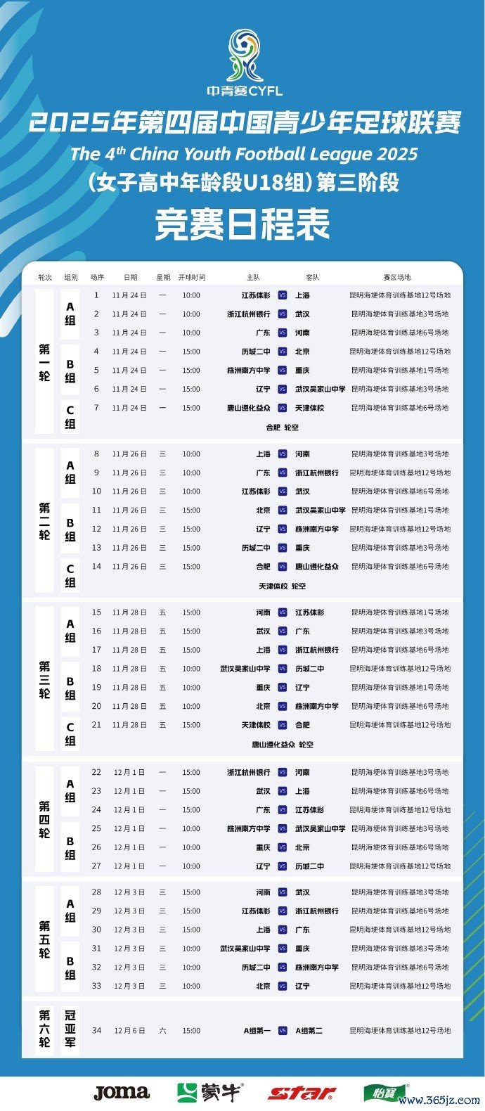 2025年第四届中国青少年足球联赛女子高中年事段U18组第三阶段将于11月24日至12月6日在云南省昆明海埂高原检修基地举行。