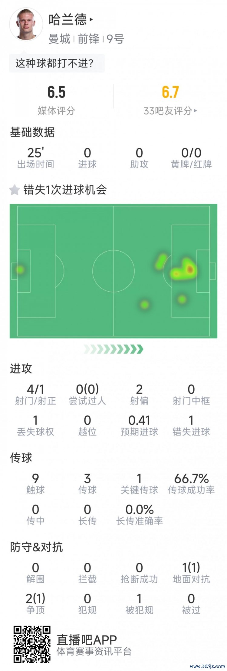哈兰德替补登场数据:4射1正,1次错失良机,1次要津传球