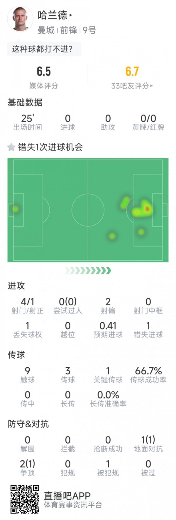 11月26日讯 在本轮欧冠曼城0-2不敌勒沃库森的比赛中,哈兰德替补登场,以下为他在本场数据: 比赛期间25分钟 4次射门1次射正 1次错失良机 9次触球 1次要津传球 传球得手率67% 3次起义2次得手 评分6.5分......