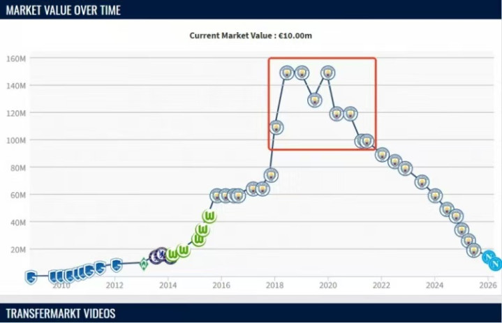 德布劳内是曼城的传奇球员,在他26岁-30岁期间身价均超过1亿欧元,巅峰期 身价更是高达1.5亿欧元,保持“亿欧先生”长达4年,但随着球员三十而立之后,受伤 也逐步增多,德布劳内的身价一路下滑,目前34岁的他身价已经跌至1000万欧元。