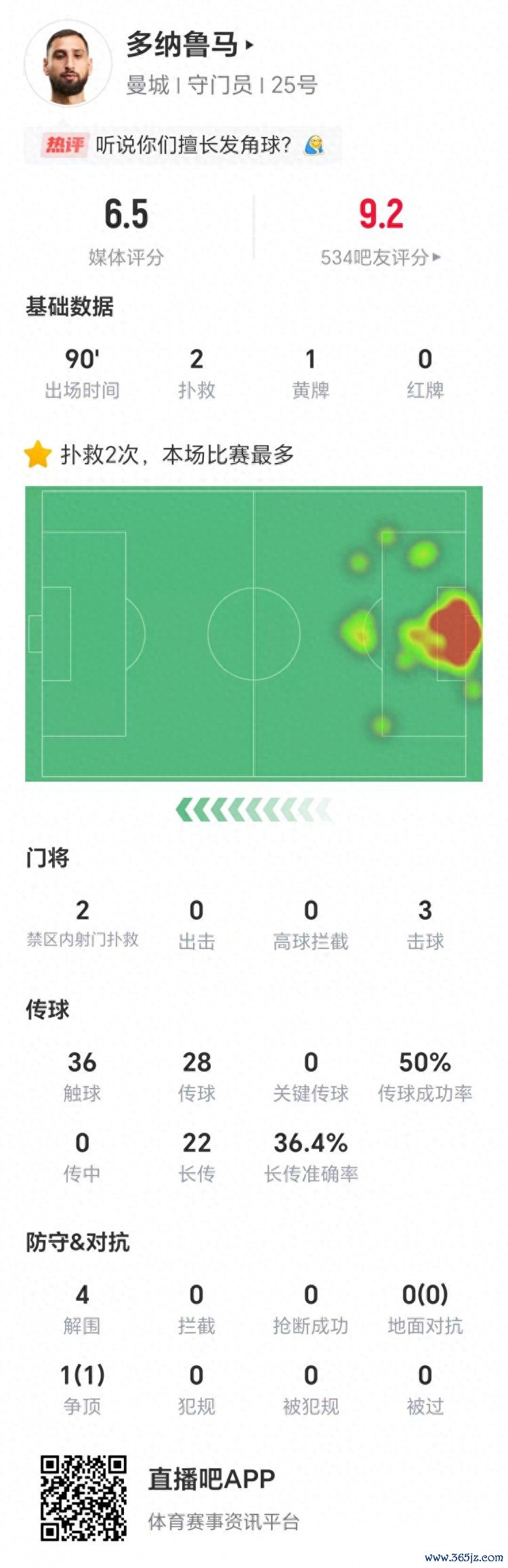 出击踌躇? 多纳鲁马全场数据: 两次扑救, 22次长传告捷率36.4%