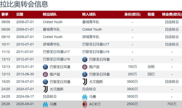 拉比奥特本年夏天与队友打架,被马赛廉价甩卖,身价2500万欧元,转会费700万欧元就打骨折卖给了AC米兰。拉比奥特的年薪从税前630万欧元(马赛),暴涨50%操纵,涨至税前920万欧元(AC米兰)。