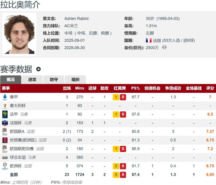 现年30岁拉比奥特,身高1.91米,左脚球员,能踢中场、后腰和前腰。拉比奥特加盟米兰以来,出战了米兰一说念的4场比赛,包括3场意甲和1场意大利杯的比赛,拉比奥特一说念首发,并踢满了4场比赛,同期拉比奥特进入的4场比赛米兰获取了全胜战绩。高出是北京本领9月29日凌晨,意甲第5轮,10东说念主AC米兰主场2-1打败了领头羊、卫冕冠军那不勒斯,豪取联赛四连胜,助AC米兰登顶意甲积分榜。