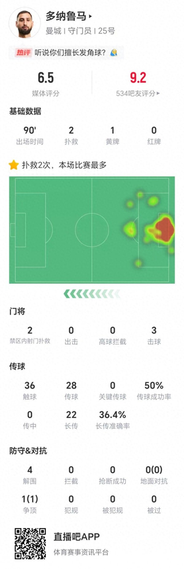 直播吧9月22日讯 英超第5轮比赛,曼城前去酋长球场挑战阿森纳。本场比赛,曼城门将多纳鲁马在补时阶段出击有些踌躇,导致敌手将比分扳平。 赛后手艺统计数据裸露,多纳鲁马本场比赛有两次扑救,均为濒临敌手在禁区内的射门。多纳鲁马全场28次传球告捷率50%,22次长传告捷率36.4%,另外他还有4次突围。 独家看英超就在咪咕......