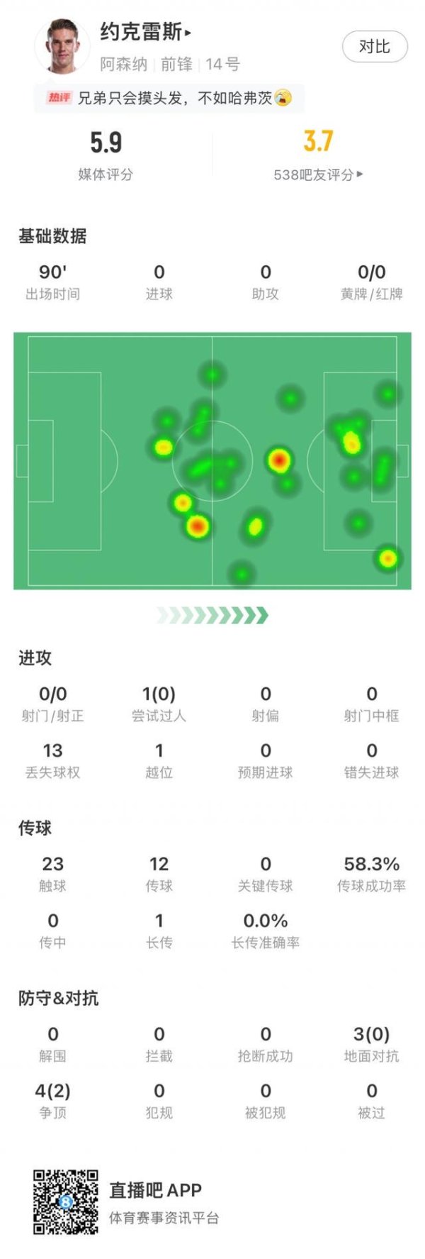 英超第5轮焦点战,阿森纳凭借马丁内利的吊射1-1绝平曼城。此役约克雷斯踢满全场,媒体评分5.9分(全队最低)、吧友评分3.7分。 约克雷斯0射门、0过东谈主、13次丢失球权。全场仅23次触球,黑白门将中本场触球数最少的球员;3次大地抵抗0到手,4次争顶2次到手。 独家看英超就在咪咕......