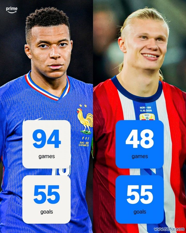 哈兰德与姆巴佩的国度队进球数相同,但姆巴佩所用场次为94场,哈兰德场次仅为姆巴佩的一半多少许。