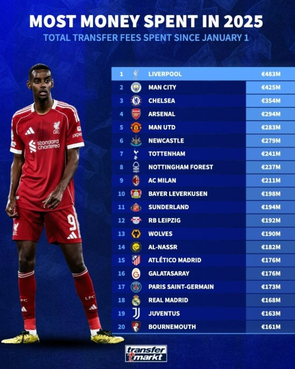 10月25日讯 德转盘货了足坛俱乐部在2025年转会支拨榜单(自本年1月1日),其中利物浦居首,具体榜单如下: 1、利物浦 4.83亿欧 2、曼城 4.25亿欧 3、切尔西 3.54亿欧 4、阿森纳 2.94亿欧 5、曼联 2.83亿欧 6、纽卡 2.79亿欧 7、热刺 2.41亿欧 8、诺丁汉丛林 2.37亿欧 9、AC米兰 2.11亿欧 10、勒沃库森 1.98亿欧 11、桑德兰 1.94亿欧 12、莱比锡 1.92亿欧 13、狼队 1.90亿欧 14、利雅获得手 1.8......