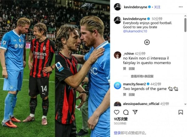 9月29日讯 在对阵AC米兰的比赛后,那不勒斯中场德布劳内在外交媒体上传了与莫德里奇的合影。 本场比赛,那不勒斯1-2输球。赛后,德布劳内在外交媒体上传了与米兰中场莫德里奇的合影,并配文写说念:“每个东说念主皆享受精彩的足球,很好意思瞻念见到你,昆季@lukamodric10。”......