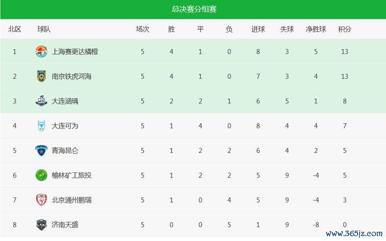(注:中冠总决赛A组积分榜上,大连涵瑀积8分,排行北区第三,大连可为积7分,排行北区第四。)